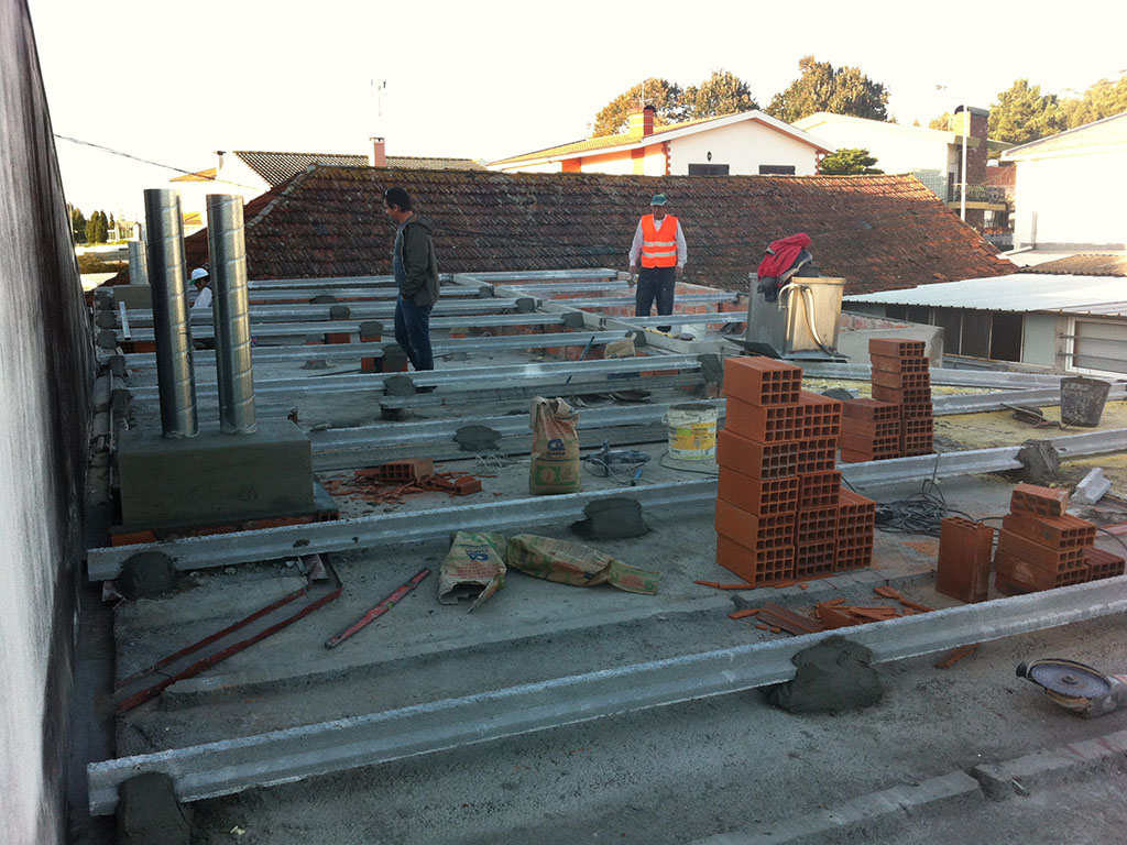 Reabilitação de cobertura, com remoção das telhas existentes de fibrocimento que continham amianto e aplicação de painel sandwich. Aplicação de rufos, sapatas, chapins e gueiros novos em chapa lacada. Impermeabilização das platibandas e das chaminés com telas minerais.